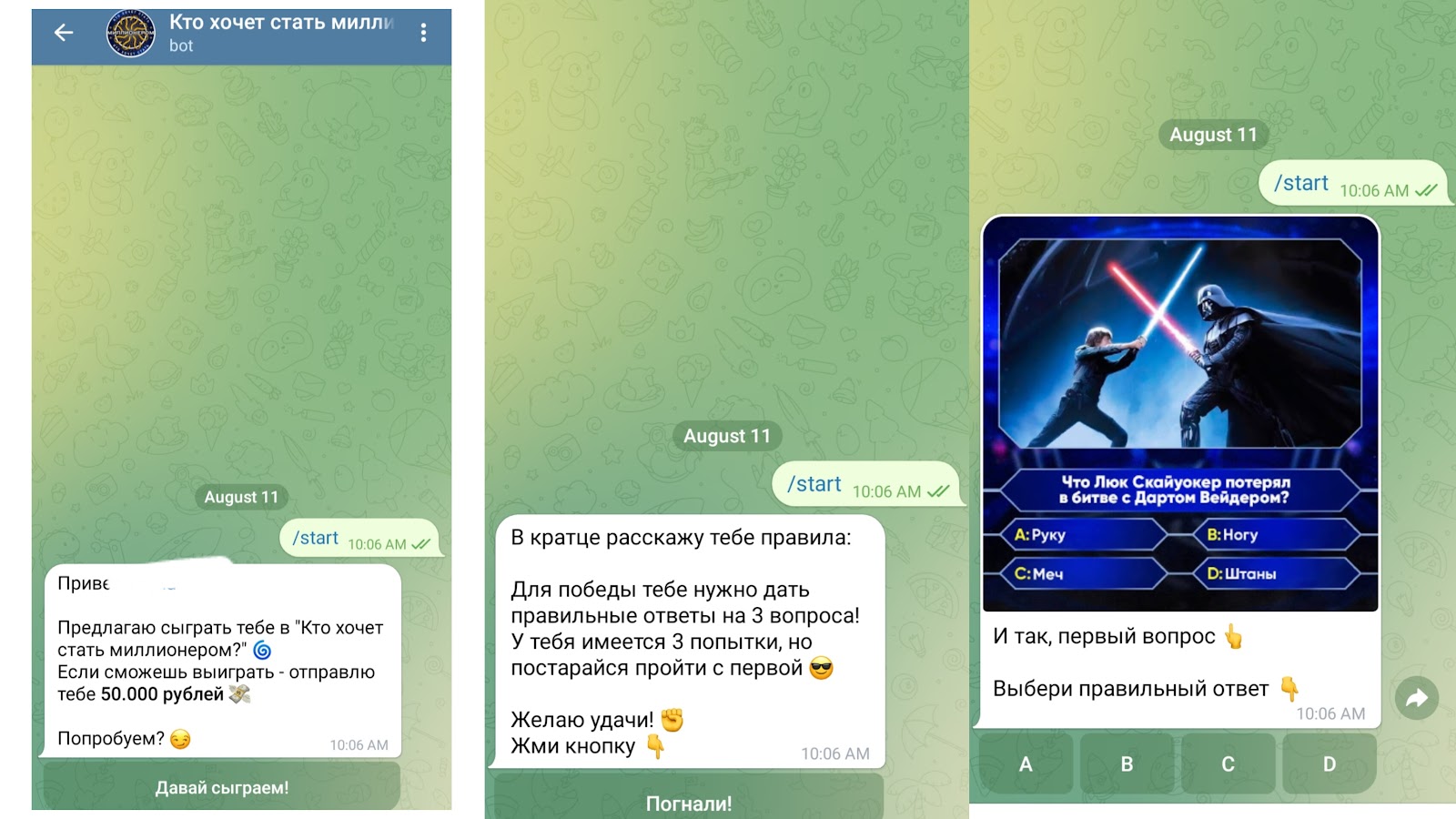 Для начала игры необходимо было запускать бота, нажав клавишу “Старт”. После чего приложение уведомляло о том, что у пользователей есть шанс выиграть 50 000 рублей. Для того чтобы получить деньги, нужно ответить на 3 вопроса правильно. Исходя из правил проекта, у игроков есть 3 попытки пройти испытание, однако стоит предоставить правильные ответы с первого раза. Возможно, с новой попыткой приз будет уменьшаться. После нажатия на “Погнали”, Millionaire06 bot будет предоставлять 3 рандомных вопроса с 4 ответами. Например, игроков могут спросить о персонажах “Звездные Войны” или про известные цитаты.