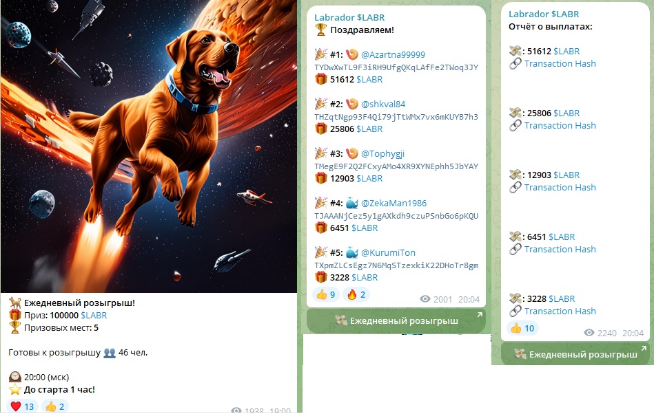 - в Телеграм создано несколько каналов: Labrador $LABR на русском (@labrador labr ru, 62,7 тыс. подписчиков) и английском (@labrador labr, 104,5 тыс.) языках, Labrador LABR Chat для пользователей labrador chateng (574 участника) и чат-бот LABR Bot для холдеров @LABR robot.
