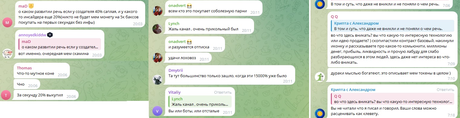 Закинул пару соток на старте думал, лабрик даст иксы. Через час вижу, что 70% монет у 3 человек? Скам пахнет через экран! Чекнул твиттер фолловеры боты, в чате одни пампанём, парни! Ага, только не мы! Кто-то уже вывел, мы сосём лапу! 😡