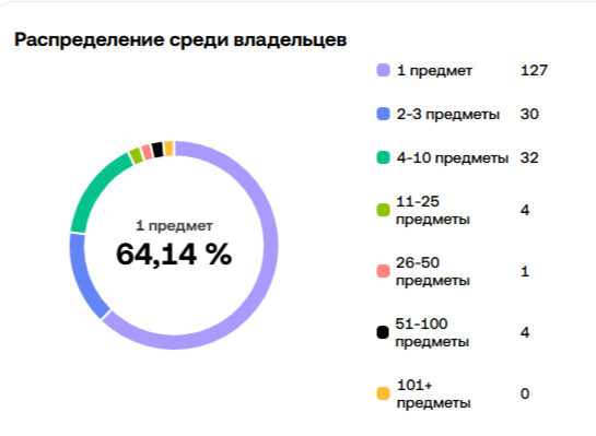По распределению картинок первое место занимают пользователи, у которых одна карточка, их количество 127 человек. Крупные холдеры не сильно заинтересованы в коллекции. Юзеры, которые имеют больше 100 гифтов, вообще не видят смысла в потерянных собаках и не приобретают их.