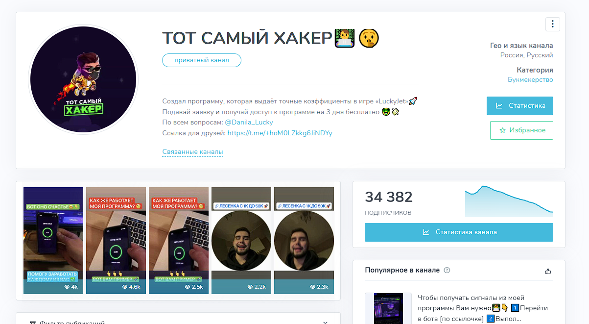 На канале было примерно 10-13к подписчиков. Его администратором выступал Даня «Dan Luck» – такой аккаунт сейчас не существует. Основной контент — сигналы для Lucky Jet, азартной онлайн-игры со ставками. В ней юзеры должны успеть «забрать» выигрыш до того, как с экрана исчезнет объект – например, персонаж. Чем дольше раунд, тем выше коэффициент, но и риск потери возрастает.