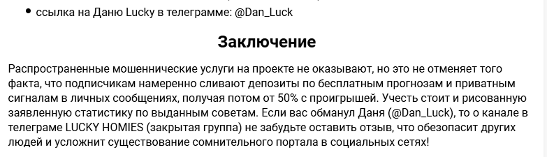 Если вы были подписчиком канала Lucky Homies и знакомы с его автором Дэном «Лаки», обязательно напишите комментарий. Расскажите, как строилось ваше сотрудничество и удалось ли вам заработать по советам каппера.