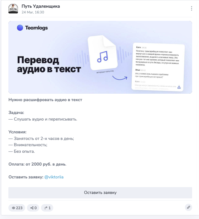 Для начала укажем, что проект продвигали через сомнительные группы в ВК и Телеграм-каналы, которые связаны с рекламой скама. Например, в ТгСтат сохранилась запись с канала Путь Удаленщика: