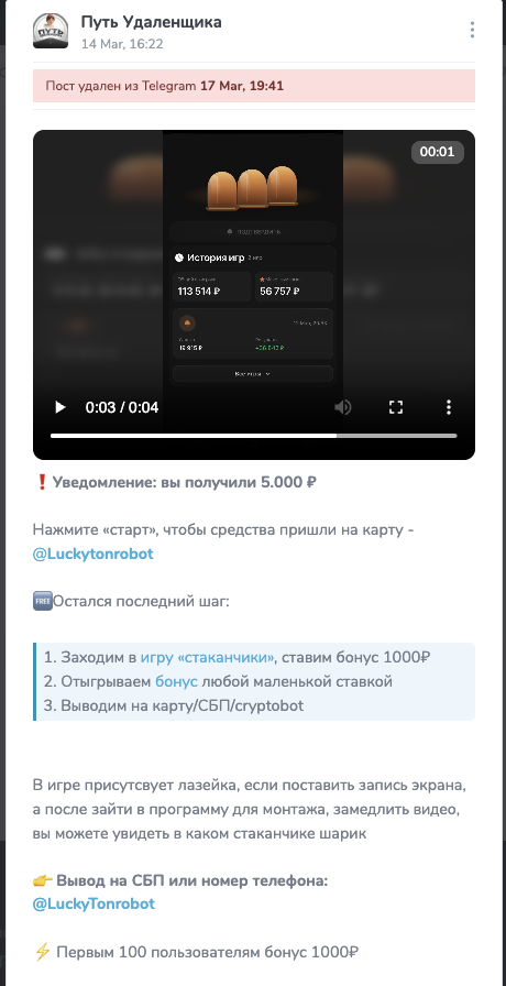 В ней обещают возможность гарантированно забрать и приумножить бонус в 1 тысячу рублей и в итоге вывести 5 тысяч рублей даже без пополнений. Автор рассказывает о том, что выигрыш гарантирован за счет «обмана бота» путем записи экрана и замедления видео, чтобы угадать верный стакан. Но это ложь, а сам шарик может быть вообще не связан со стаканом, под который его положили.