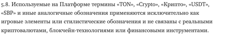 Самое смешное содержится в пункте 5.8. В нем буквально подтверждается, что создатели бота – мошенники, которые используют наименования криптовалют и платежных сервисов как игровые элементы, не связанные с реальными финансами: