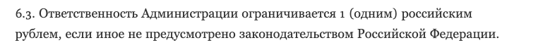 А в пункте 6.3 сказано, что ответственность Администрации платформы ограничивается 1 российским рублем.