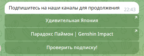 Чтобы получить бесплатную Луну или примогемы, пользователям необходимо в меню бота выбрать «бесплатные крутки». Это возможность крутить рулетки и в качестве приза получать внутреннюю валюту игры. Однако, доступ к рулеткам просто так не дается. Чтобы его получить, пользователям предлагается подписаться на канал. При каждом выборе: что получить, какую рулетку крутить и т.д., подписчик должен подписаться на какой-то сообщество в Телеграм. По итогу добраться до реальной рулетки нам так и не удалось. Когда выбираешь в меню «получить бесплатную крутку» и подписываешься на канал, бот пишет, что крутка добавлена. Вот только, как ей воспользоваться, непонятно.