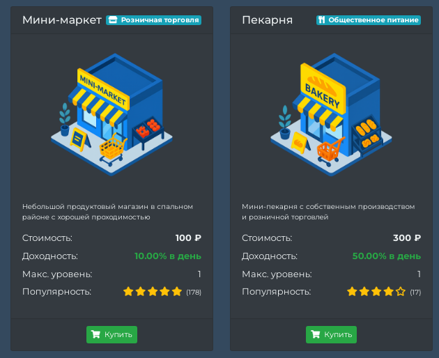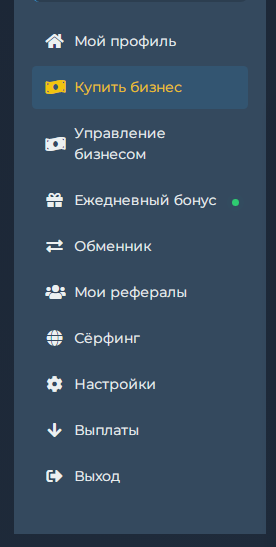 Чтобы купить бизнес в игре, нужно пополнить баланс. Сделать это можно через Payeer, банковские карты или криптовалюту (какую именно — не указано). Минимальный платеж 100 руб., максимальный — 50 тыс. руб. Выводить деньги можно только на Payeer. Информации о комиссиях на сайте нет.
