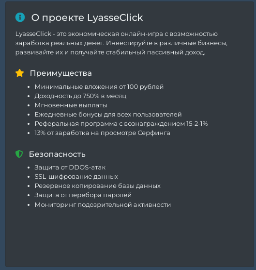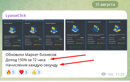 Телеграм-канал называется LyasseClick, он тоже был создан в августе 2025 года. На него подписаны 335 человек и в нем выкладывают новости проекта. Создатели обещают нереальную доходность с посекундным начислением средств.