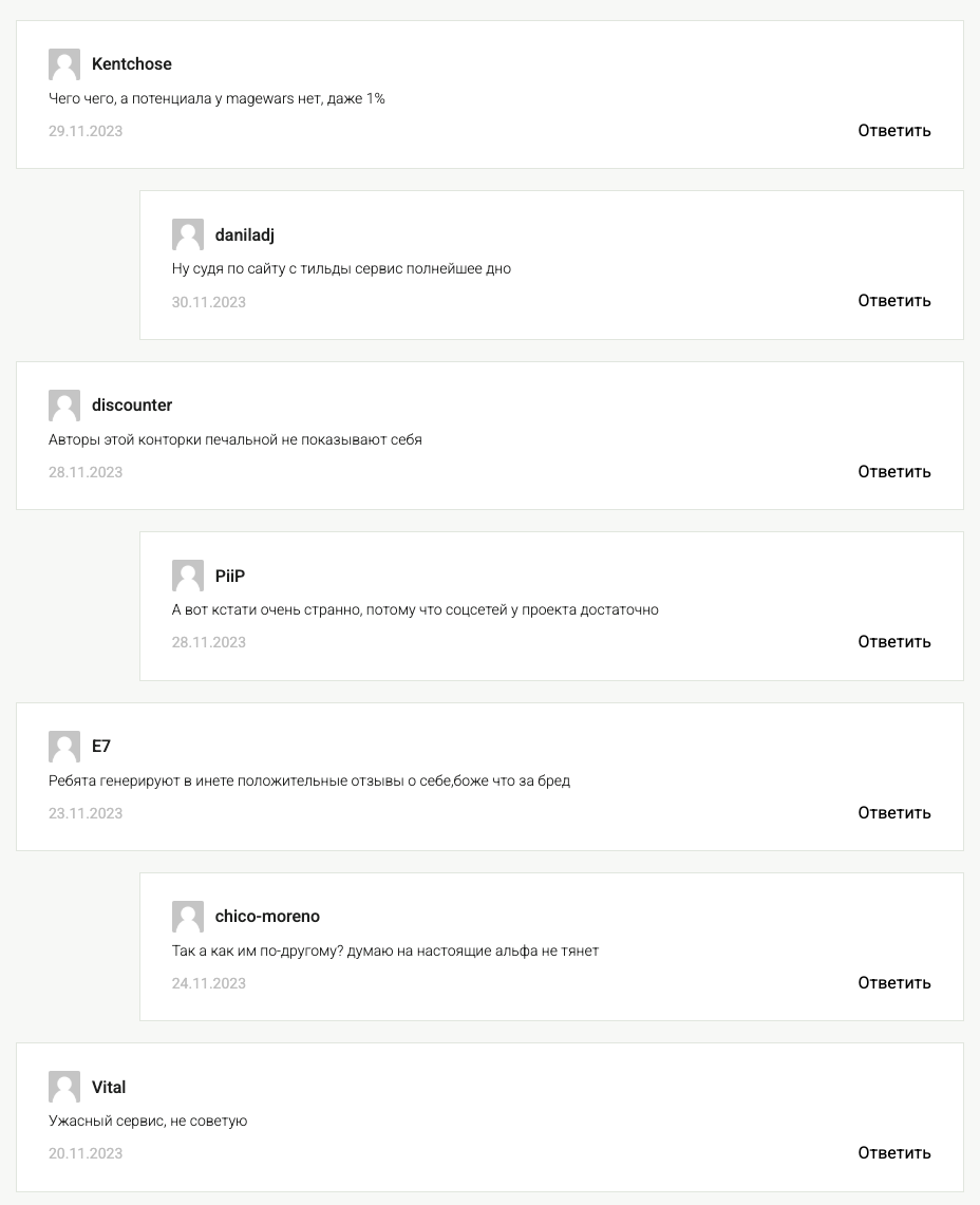 Посты просмотрены в среднем по тысяче раз, комментариев и реакций под ними нет. Это показывает, что реально проект мало кому был известен и интересен.Также в Telegram был еще один аккаунт игры — MageWarsAG, MageWarsbnb. На текущий момент он недоступен.