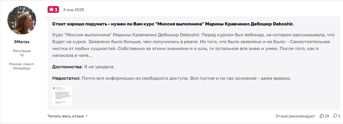 И все же стоит обратиться к независимым сторонним источникам в интернете, где люди делятся своим мнением, а администрация не препятствует этому. Если есть отрицательные отзывы Мари ДеБошир, то будут они именно в таких местах.