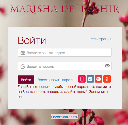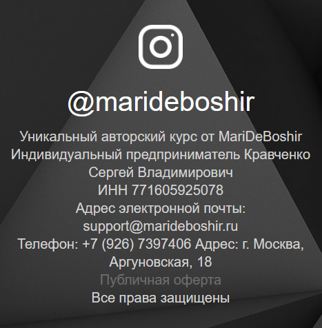 В футере сайта опубликована уже юридическая информация об услугах MarinaDeBoshir. Зарегистрирован статус индивидуального предпринимателя, но не самой Мариной, а ее мужем Кравченко Сергеем Владимировичем. Причем в госреестре организация числится как занимающаяся доставкой и торговлей продуктами питания, а не образовательными услугами.Второй сайт — Marishadeboshir Ru, выполнен в виде личного кабинета для клиентов проекта. Здесь можно связаться с Мариной через форму обратной связи. Сам домен зарегистрирован позже предыдущего — 14 ноября 2021 года.
