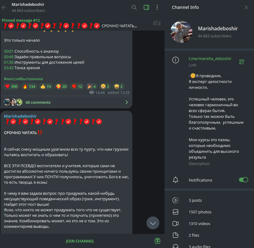 На основной Телеграм МариДеБошир подписаны около 45 пользователей. За неделю посты набирают примерно четверть просмотров от общего числа подписчиков, что является крайне высоким показателем для мессенджера. Многие оставляют комментарии и реакции, вовлеченность высокая и признаков накрутки нет.
