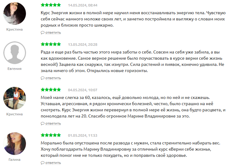 Здесь МаришаДеБошир публикует каталог своих курсов, их видеопрезентации, отзывы и другую информацию. Учебные материалы основаны на дыхательных упражнениях и «Энергии жизни».