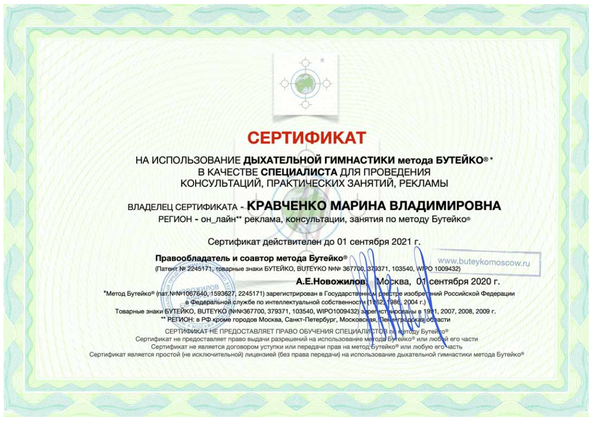 Он свидетельствует о том, что коуч получила одобрение на использование дыхательной гимнастики метода Бутейко от самого правообладателя этой методики. Стоит печать его ИП и подпись его соавтора. Но важно понимать, что это не государственный документ и он не является лицензией на коучинг в целом.