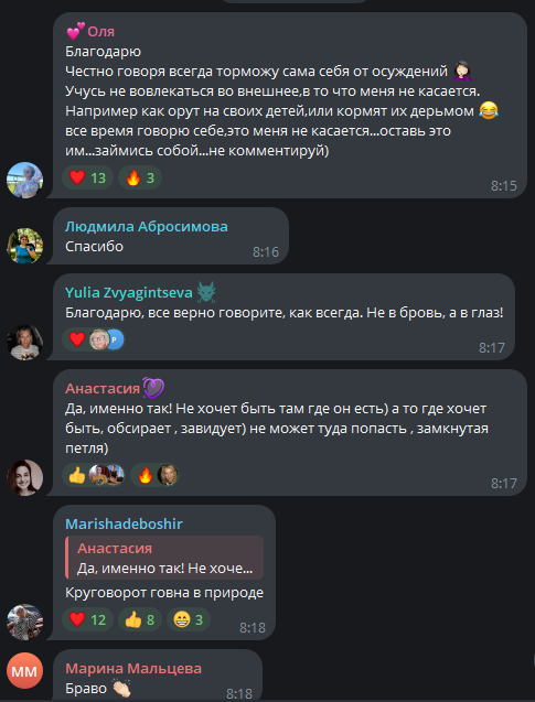 Что касается отзывов об инвестициях в Маришу ДеБошир, а именно ее курсы и тренинги, она сама публикует много сообщений из ТГ и не только от благодарных подписчиков и клиентов. Также на ее ресурсах открыты комментарии, где аудитория проявляет большую активность и преданность блогеру. Но важно понимать, что все эти площадки модерируются самой Мариной. Это может быть причиной того, что здесь только положительные мнения.