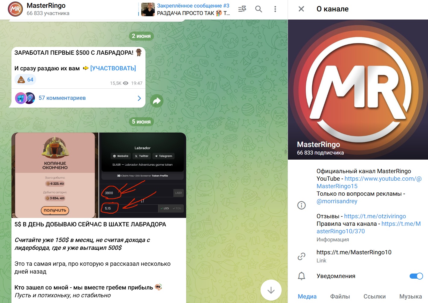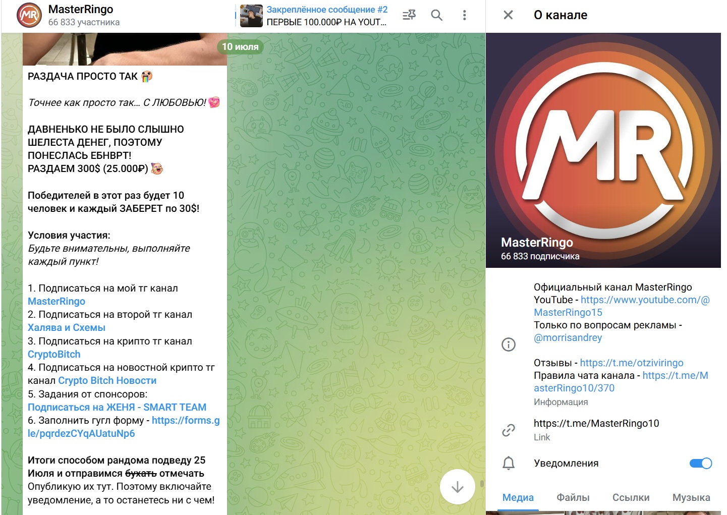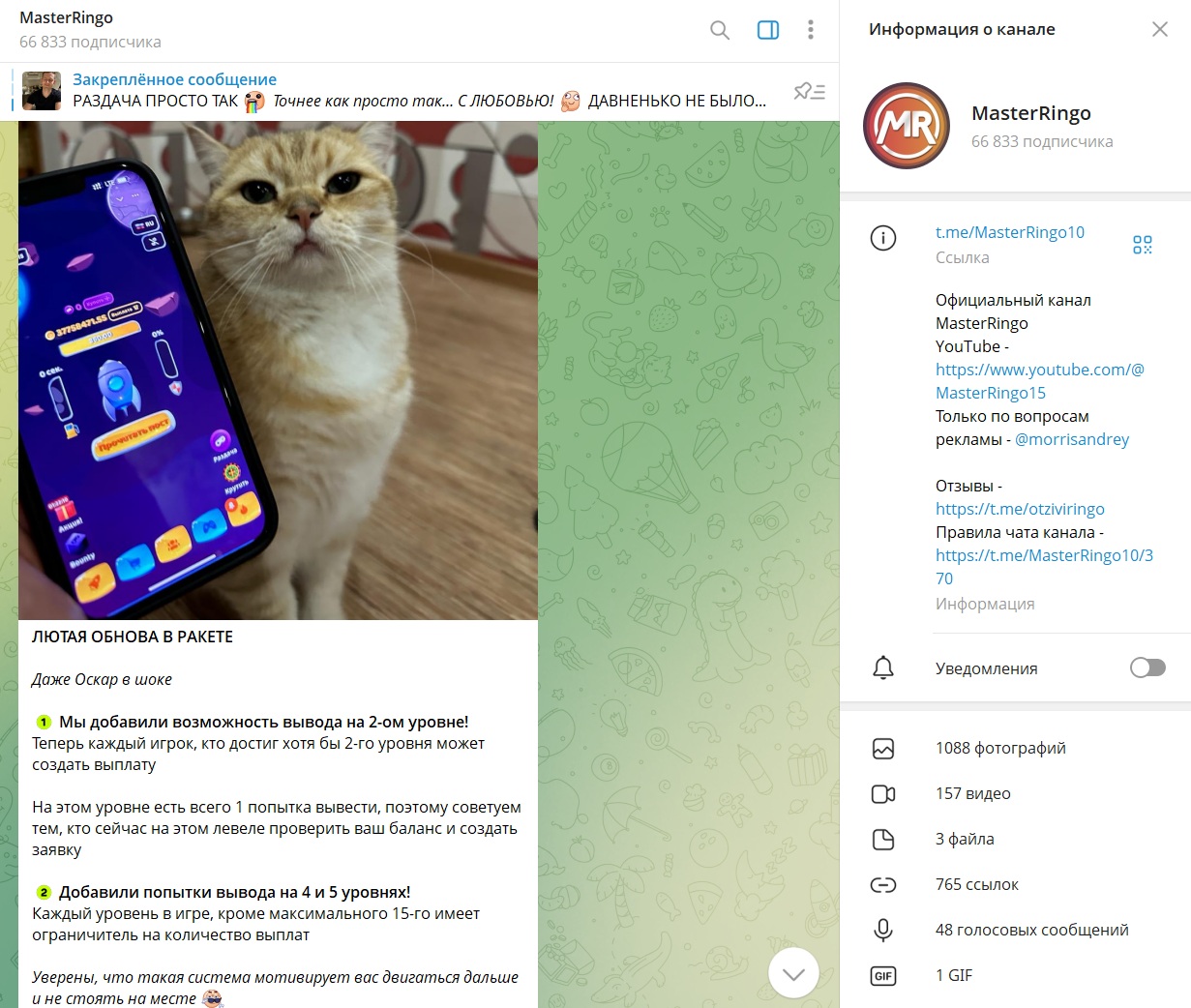 В целях продвижения паблика в ТГ MasterRingo часто запускает конкурсы, обязательным условием которых является подписка на партнеров. Таким образом он не только рекламирует продвигаемые паблики, но также поднимает вовлеченность подписчиков.