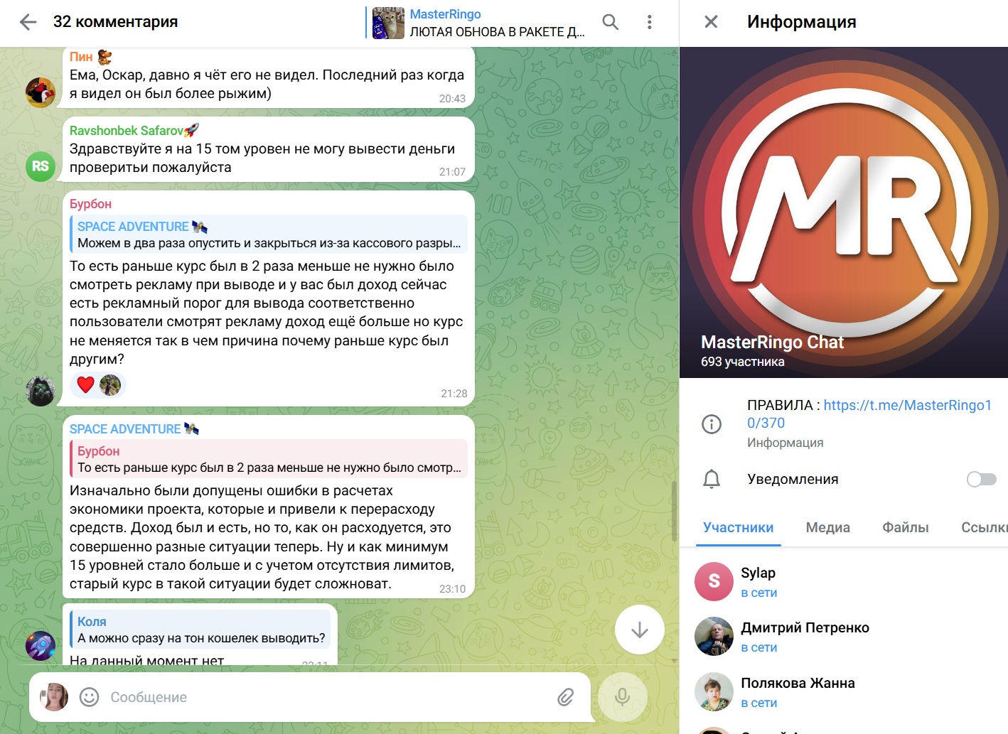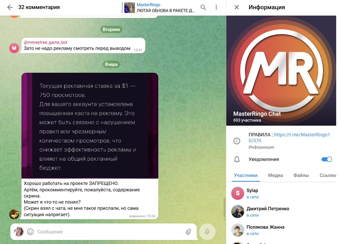 В основном Телеграм канале Мастер Ринго комментарии включены, но там не нашлось отзывов на рекламируемые блогером сервисы. При этом встречаются негативные отклики на игры самого Master Ringo. Геймеры говорят, что в них невозможно заработать – ставки на рекламные просмотры слишком низкие.