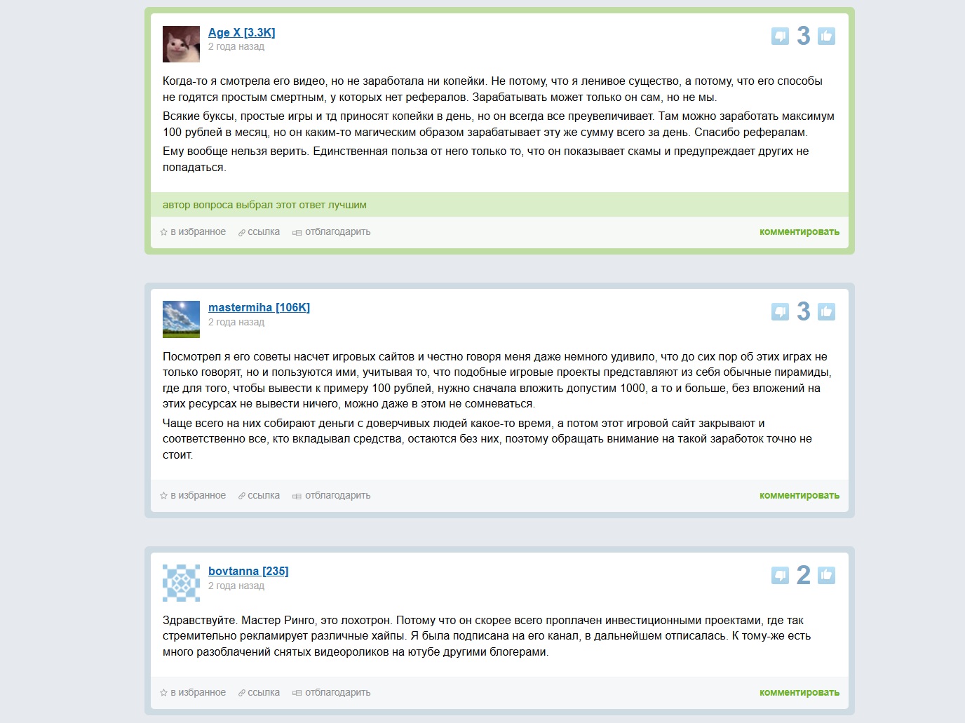 В интернете отзывы о Мастер Ринго в большей степени отрицательные. Относительно его обзоров говорят, что рекомендуемые им игры бесполезны в плане заработка, а сам блогер зарабатывает на реферальных ссылках.