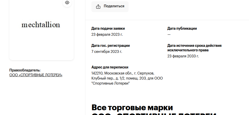 У компании есть еще юридическое лицо, куда можно направлять обращения. В целом патент на бренд игры «Национальная Лотерея Мечталлион» зарегистрирован 23 февраля 2023 года.Как играть в Mechtallion