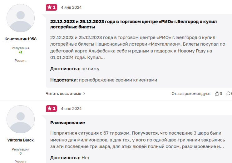 Помимо вышеперечисленного, пользователи в отзывах об игре «Национальная Лотерея Мечталлион» пишут, что проект лохотрон. Стоит отметить, что негативной обратной связи гораздо больше.