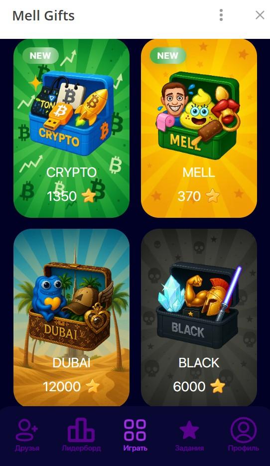 Телеграм-бот Mell Gifts (mellgifts bot) предлагает участвовать в розыгрышах. Есть каталог с различными кейсами, в которые входит несколько телеграм-подарков. Открыв его, запускается розыгрыш в формате рулетки. Выпадает один подарок. Оплата за открытие кейсов производится телеграм-звездами.