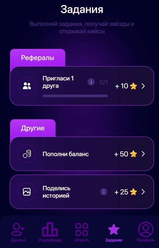 Звезды можно зачислить со своего аккаунт в Телеграме, а можно получать бесплатно, выполняя простые задания. Например, награда начисляется за приглашение рефералов, публикации истории и прочие легкие действия. Но заданий немного, поэтому заработать много звезд для открытия кейсов не получится. Придется вкладывать собственные средства.