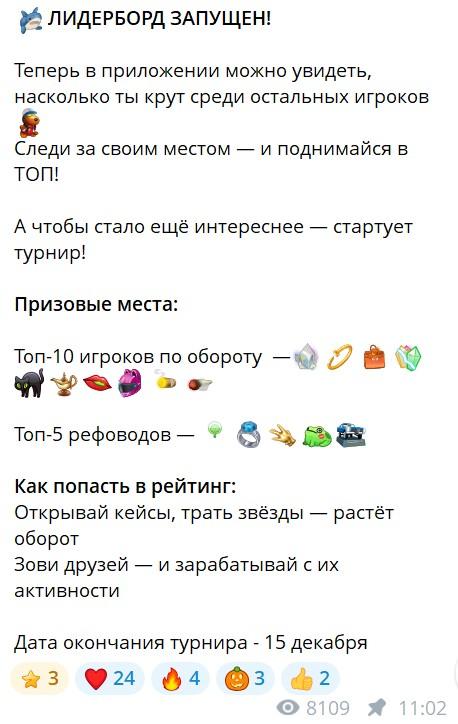 В боте есть таблица лидеров по обороту и по рефералам. Тем, кто займет первые несколько мест, обещают подарки. Какие именно, не уточняется. Турнир будет завершен только 15 декабря.
