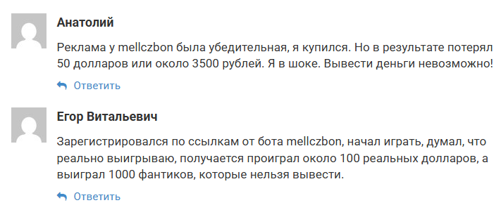 Мы нашли в интернете исключительно негативные комментарии об этом проекте. Люди жалуются на мошенничество, пишут, что вывести деньги из рекламируемых ботом онлайн-казино невозможно.