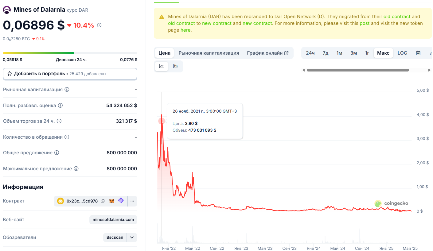 - сейчас стоимость токена DAR близка к историческому минимуму, она примерно в 50 раз меньше, чем была на пике в 2021-м году;