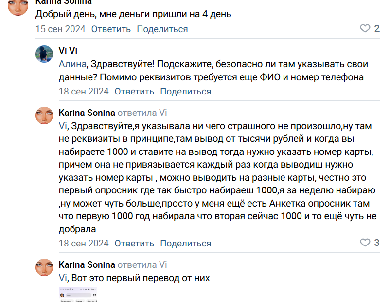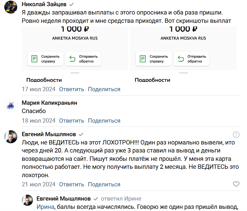 Участники опросов подтверждают, что минимальный вывод составляет от 1000 руб., а карту система не запоминает. Каждый раз можно вводить новые данные платежной системы. На вопросы о том, правда ли платит деньги Moiopros некоторые работники предоставляют скриншоты в качестве доказательств вывода средств. Такие кейсы встречаются неоднократно.