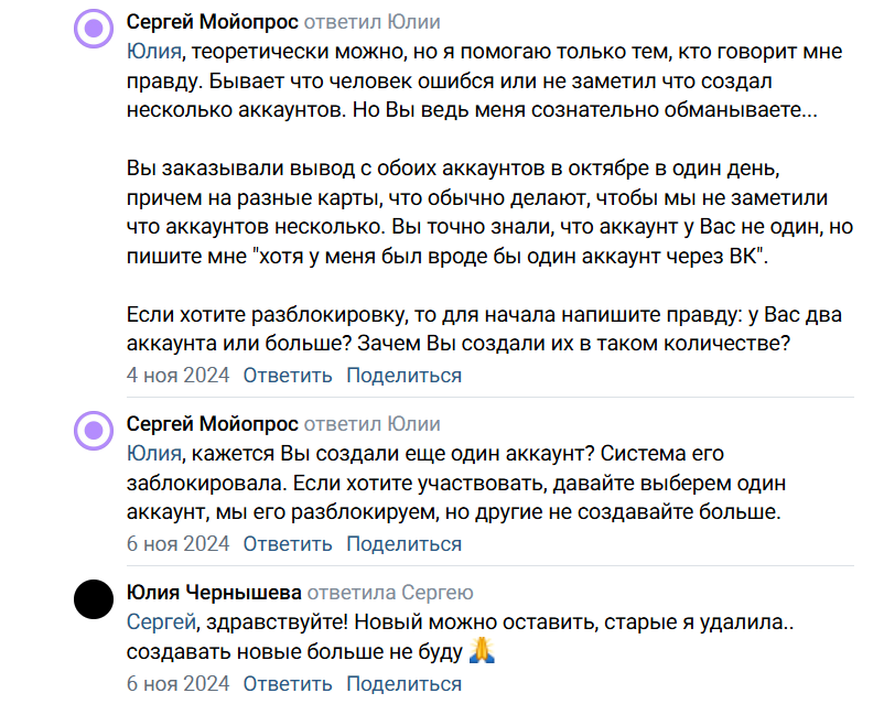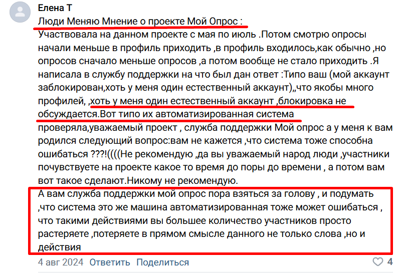 В группе Опросы с вознаграждением без лохотронов действительно можно отследить всю историю проблем, возникающих у пользователей. Ряд аккаунтов в 2024 году действительно были заблокированы, отзывы о сайте Moiopros в связи с этим были негативные. Часть блокировок произошла ошибочно, а ряд — за нарушение правил анкетирования и работу с нескольких аккаунтов одного пользователя. Также ошибочные блокировки возникли, к примеру, из-за включенного ВПН.