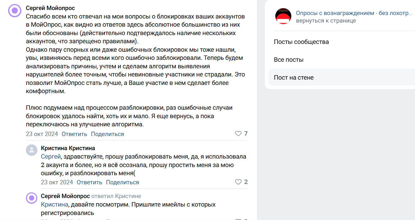 В ответ на негативные отклики с отзывами клиентов о блокировке аккаунтов на Мой опрос и проблемами с выводами средств, менеджер приглашает участников для открытых обсуждений на стене в группе ВКонтакте.