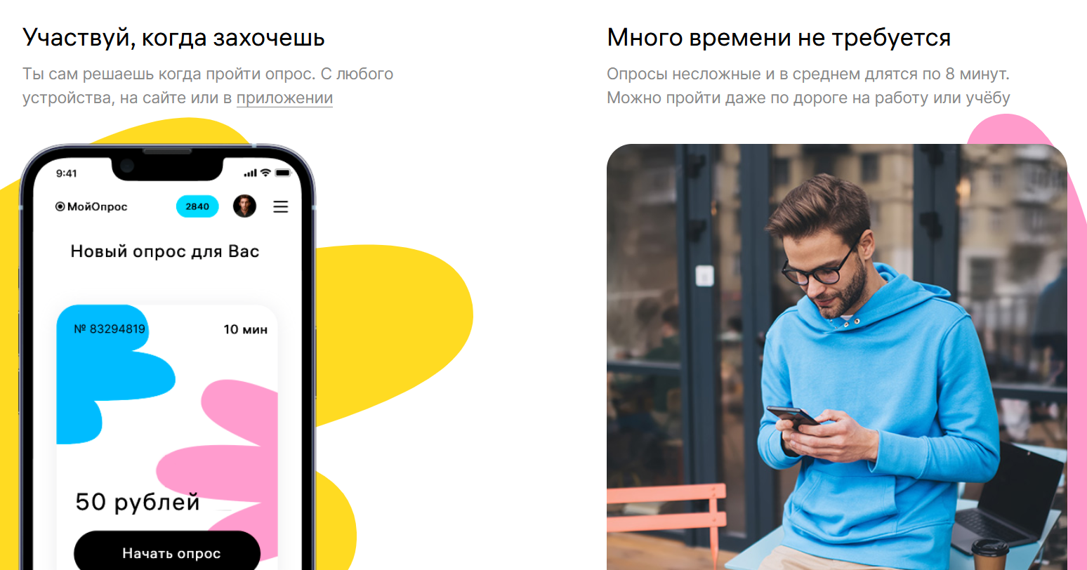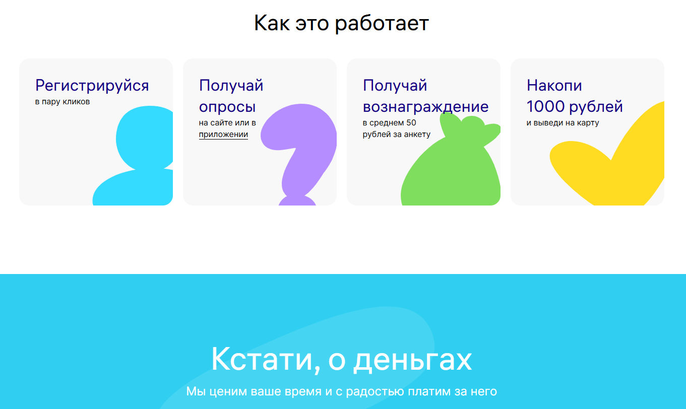 Разработчики отмечают преимущества подработки – проходить анкеты можно в любое удобное время, а длительность одного опроса в среднем составляет около 8 минут. Средняя стоимость подобной анкеты колеблется в рамках 40–50 рублей, однако цена может меняться.