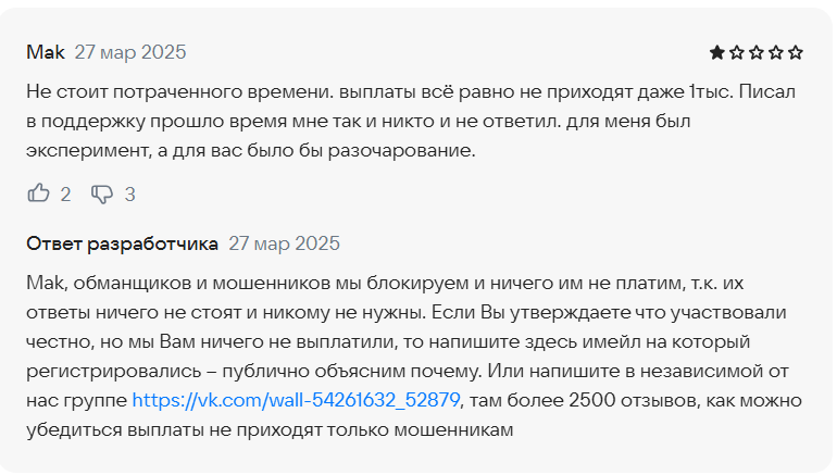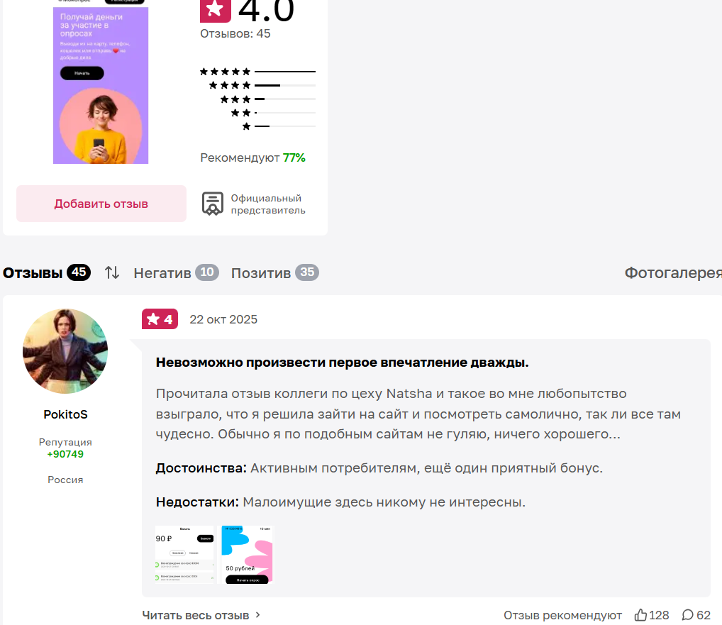 Чтобы выяснить правда или нет сервис Мой опрос предоставляет честный заработок, нужно углубиться в комментарии юзеров. За несколько лет к приложению Мой опрос на RuStore появилось свыше 300 оценок, положительные отзывы к приложению Мой опрос превалируют.