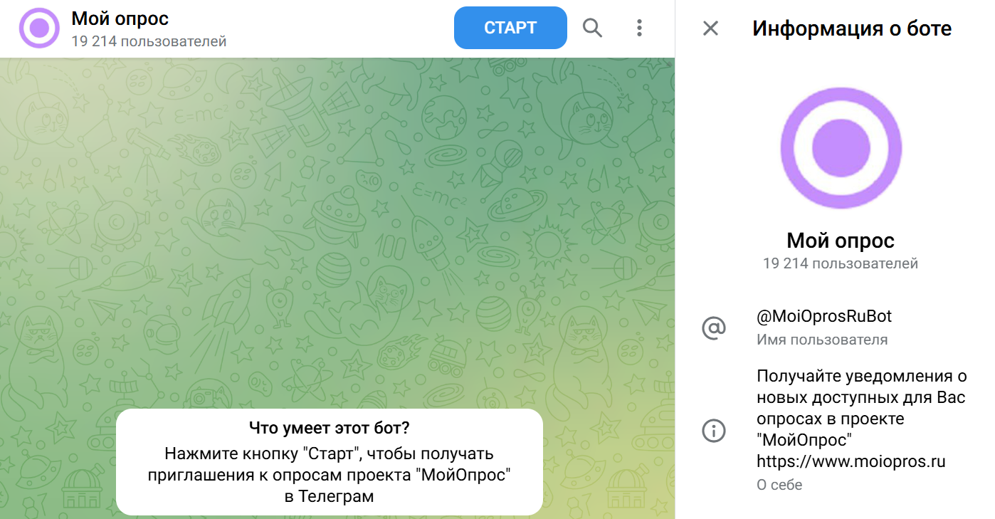 Взаимодействовать с проектом можно через Телеграмм-бот MoiOprosRuBot. Боты являются распространенным инструментом для опросников. Телеграм канал Мой опрос в описании карточки бота не представлен.