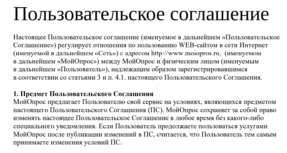 В Пользовательском соглашении не презентуются данные компании, от лица которого ведется посредническая деятельность. Сервисом могут пользоваться лица достигшие 16 лет, а также более молодые юзеры от 10 до 16 лет, у которых есть разрешение родителей на регистрацию. Последний пункт является достаточно сомнительным, так как не указано как проверяется факт наличия такого разрешения. Несовершенные лица не смогут в полной мере оценить возможные подводные камни в работе на Мой опрос – заработок может восприниматься как игра, а по факту исполнитель делится массой информации о себе.