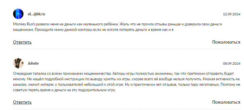В сети есть отрицательные отзывы о Monkey Rush. В своих комментариях игроки утверждают, что эта игра – очередной скам. По их словам, на это указывает анонимность игроков, отсутствие конкретики по листингу и активный призыв покупать платные улучшения за реальные деньги. Они считают, что заработать крипту в этой игре не выйдет и не стоит тратить на нее время.