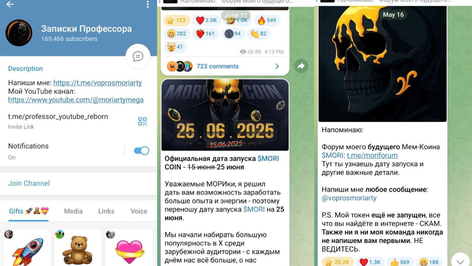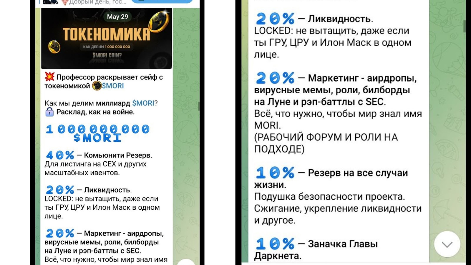 • “Челленджи”. Для получения крипты Мориарти пользователей просят выполнять задания от Профессора, например записать ролик о мемкоине или сделать нечто забавное на публике;