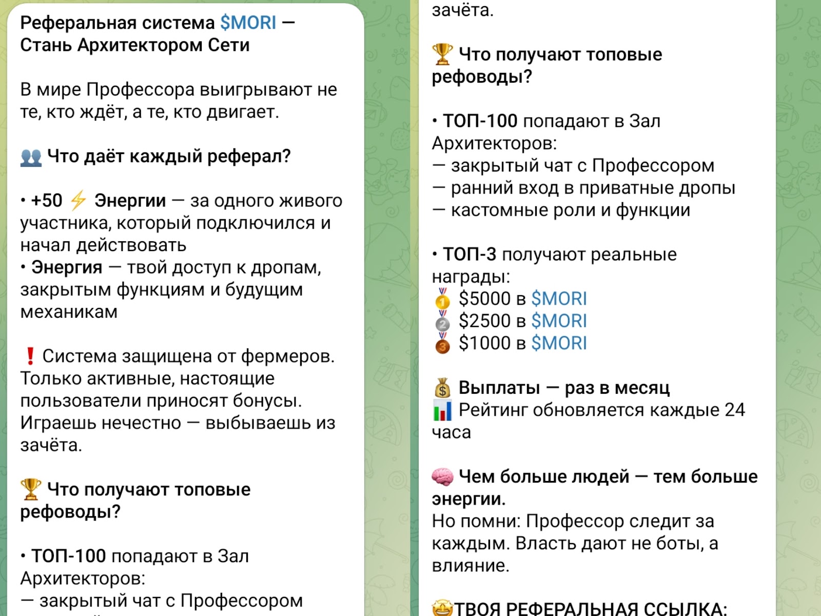 Однако если игроки получают статус топового рефовода, то есть приглашают много людей, могут ожидать реальные денежные награды от 1 тыс. до 5 тыс. долларов. Данные рейтинги обновляются в течение суток. Про airdrop койн Mori System сведения не опубликованы.