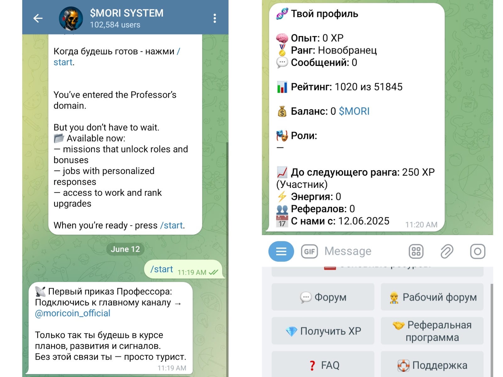 Для того чтобы получить мем коин Мориарти, нужно запускать бота Moriappbot. Он предназначен для выполнения миссий и получения бонусов, а также для увеличения рангов внутри сети. На 12.06.2025 года здесь насчитывается более 102 тыс. пользователей. Когда человек открывает бота, то его просят подписаться на официальный Telegram канал криптовалюты Mori coin Moricoin Official. Затем необходимо решить пример, и далее пользователя проинформируют об условиях игры. Изначально можно изучить сведения о профиле: опыте, ранге, сообщениях, рейтинге, балансе, ролях и прочем. Из категорий меню доступны: “Основные ресурсы”, “Форум”, “Получить XP”, “Поддержка” и другие.