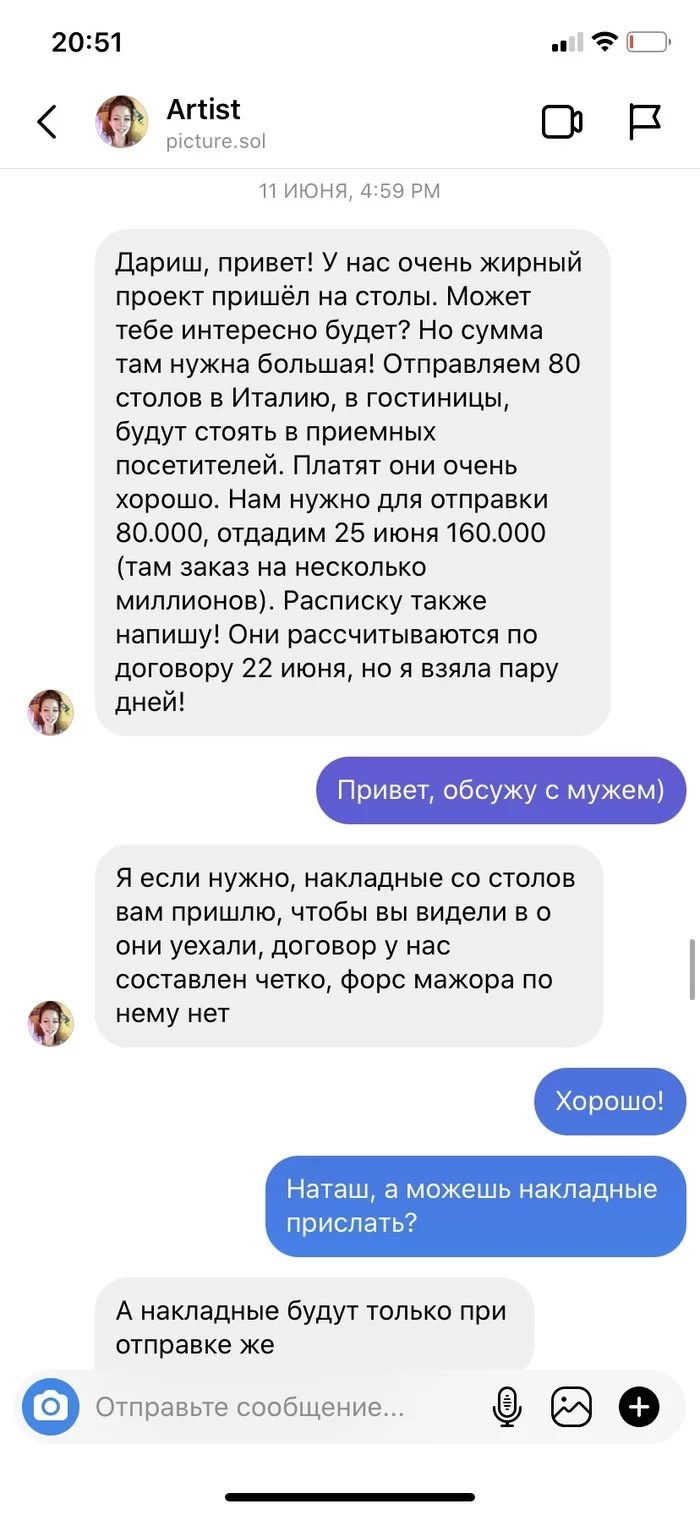 В сети можно найти огромное количество историй о том, чем занималась Наталья Соловьева. Мошенница не ограничилась только написанием картин на заказ и созданием мобильной игры. Многим подписчикам она предлагала участвовать и в других проектах. Например, в изготовлении и продаже столов из смолы в Италию. У пользователей она просила средства на начало производства, но обещала отдать в двойном размере, когда заказчики рассчитаются по контракту. Разумеется, никаких денег девушка не возвращала, также находила отговорки, почему не может это сделать. Среди таких отговорок валютный контроль, который не пропускает перевод, блокировка счета налоговой и многое другое.
