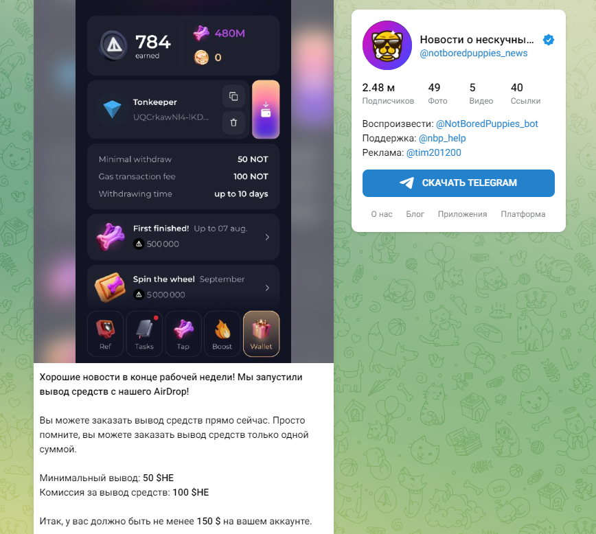 Размер минимального перевода в not bored puppies на TON-кошелек составляет 50 $НЕ, причем интересно, что размер комиссии при этом составляет все 100 $НЕ. В будущем разработчики обещают наладить возможность перевода средств без комиссий.