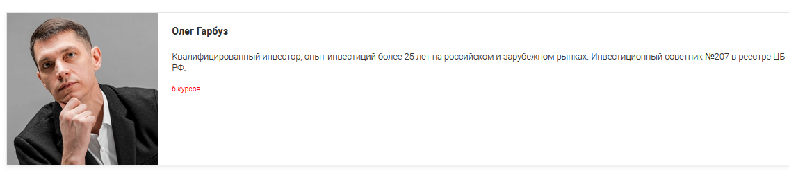 Олег Гарбуз Инвестиционный советник – опытный финансист и инвестор, преподаватель, консультант. Предлагает обучение в Школе Московской Биржи. Является автором нескольких курсов, разработчиком финансовой игры.