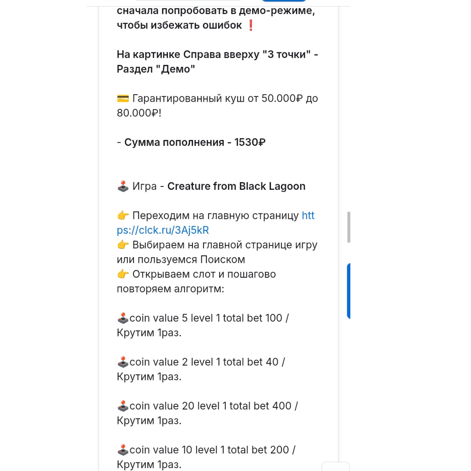 Админ проекта Oleg Dubau размещает актуальные схемы для казино, и недавно предлагал игру Creature от Black Lagoon. Обещанный куш составляет 50-80 тыс. рублей, а сумма для пополнения должна быть 1 530 рублей. Схема следующая:- coin value 5 lv 1 tb 100 — крутить 1 раз;