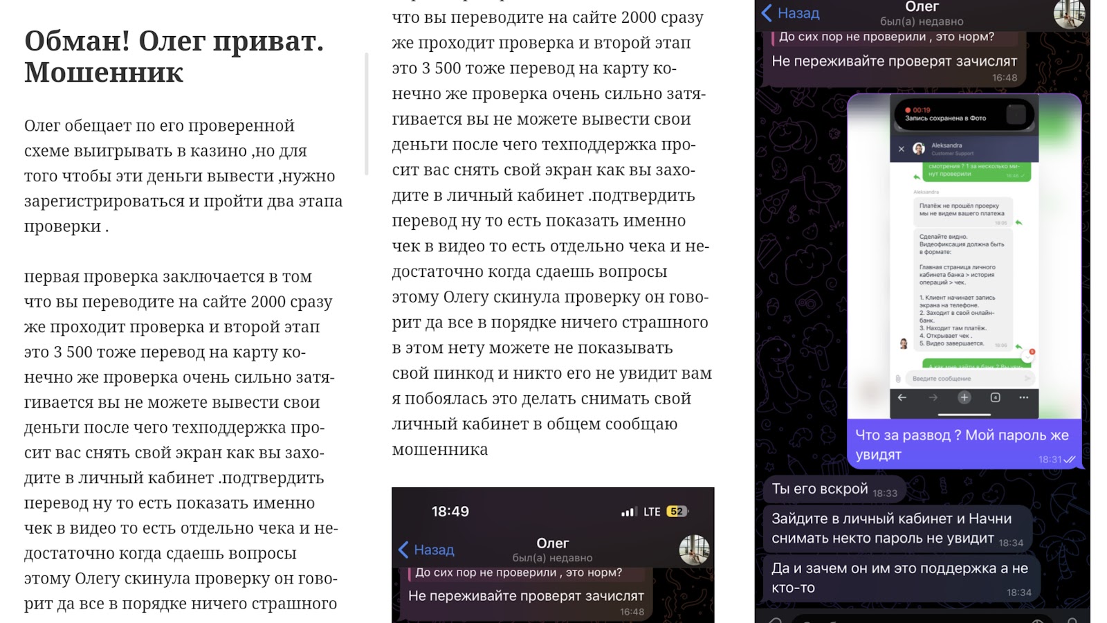 В сети мы нашли отрицательные отзывы о мошенничестве со стороны Олега. Как рассказывают пользователи, игровая площадка не позволяет выводить средства, а также не отображает внесенный депозит. Администрация просит проходить верификацию, для которой нужно на видео продемонстрировать вход в личный кабинет банка и найти платеж.