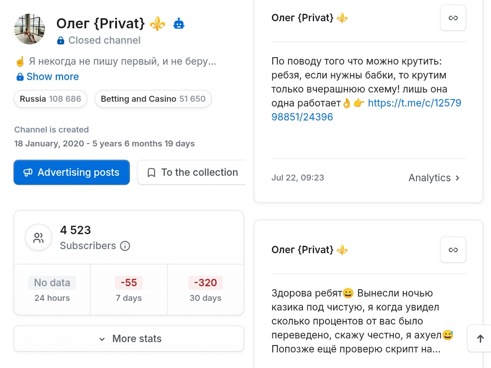 В тгк предоставляются различные посты мотивационного характера, для того чтобы привлечь аудиторию к сотрудничеству. Плюс, админ рассказывает о новых схемах, демонстрирует вывод средств и доход на играх. Однако такие материалы можно подделать. В блоге Олег Privat не встречается реклама чужих Телеграмм каналов.