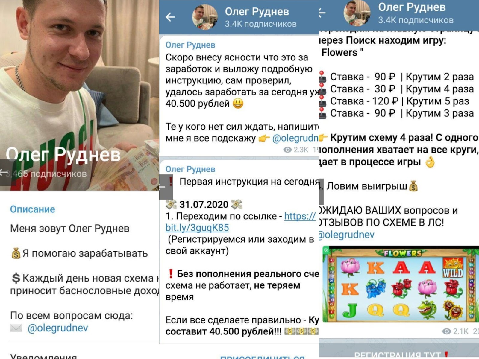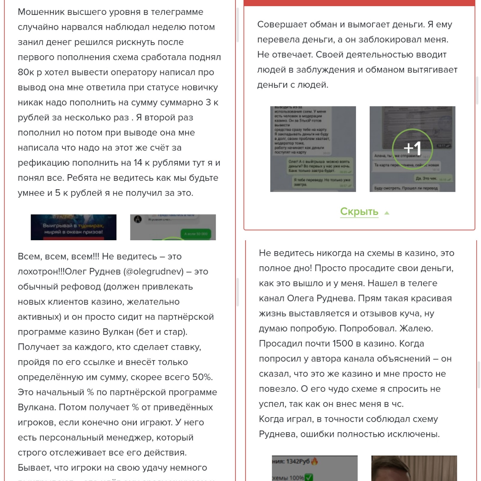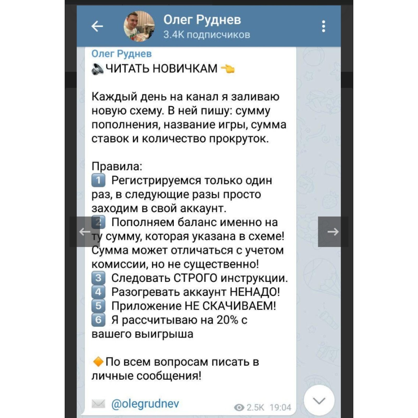 Олег Руднев отзывы на независимых ресурсах получил негативные. Автор ведет блог в Телеграмме, где предлагает рекомендации по обходу игр. По его словам, он знает надежные схемы, которые помогут получать высокую прибыль в казино. Мы провели разоблачение работы Олега и готовы рассказать о нем правду.