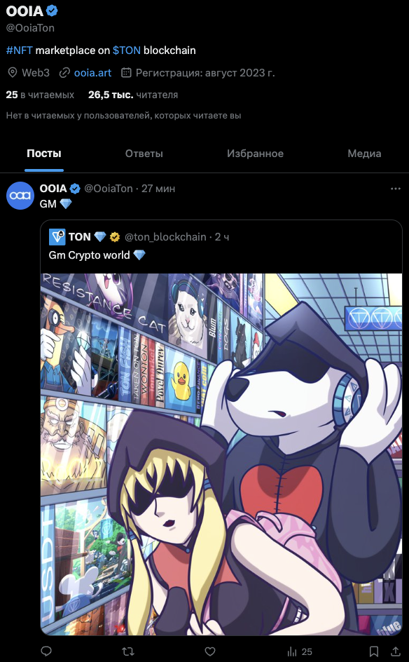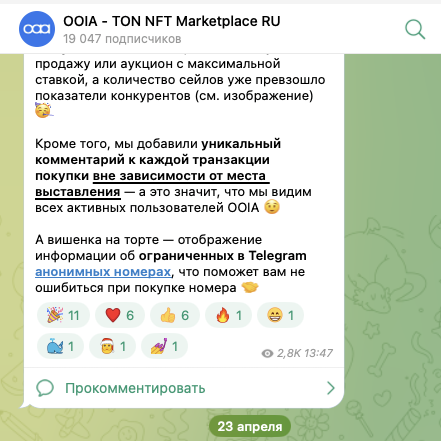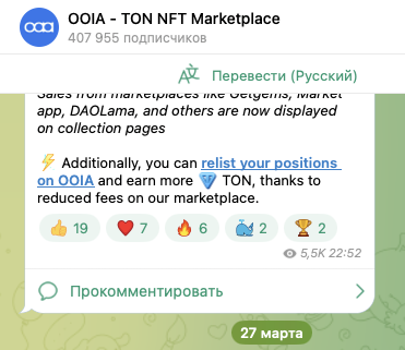Русскоязычным telegram-канал проекта называется OOIA TON NFT Marketplace Ru и находится по адресу ooiaton ru. На него подписано 19 тысяч пользователей, а присутствующие в нем публикации получают по 2,5-3 тысячи показов.