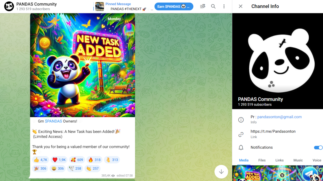 Pandas Телеграм бот, благодаря которому предлагают получать токены. Пользователям необходимо выполнять регулярные задания, за что и начисляются монеты PANDAS. Далее мы рассмотрим особенности проекта и расскажем, можно ли здесь заработать или это развод.